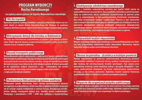 W tym roku KWW Ruch Narodowy wystawia swoich kandydatów do sejmików wojewódzkich w całej Polsce. Kandydatem proponowanym w województwie lubuskim w okręgu nr 2 obejmującym powiaty słubicki, sulęciński, międzyrzecki i świebodziński jest m.in. Tomasz Malaika, mieszkaniec Rzepina.